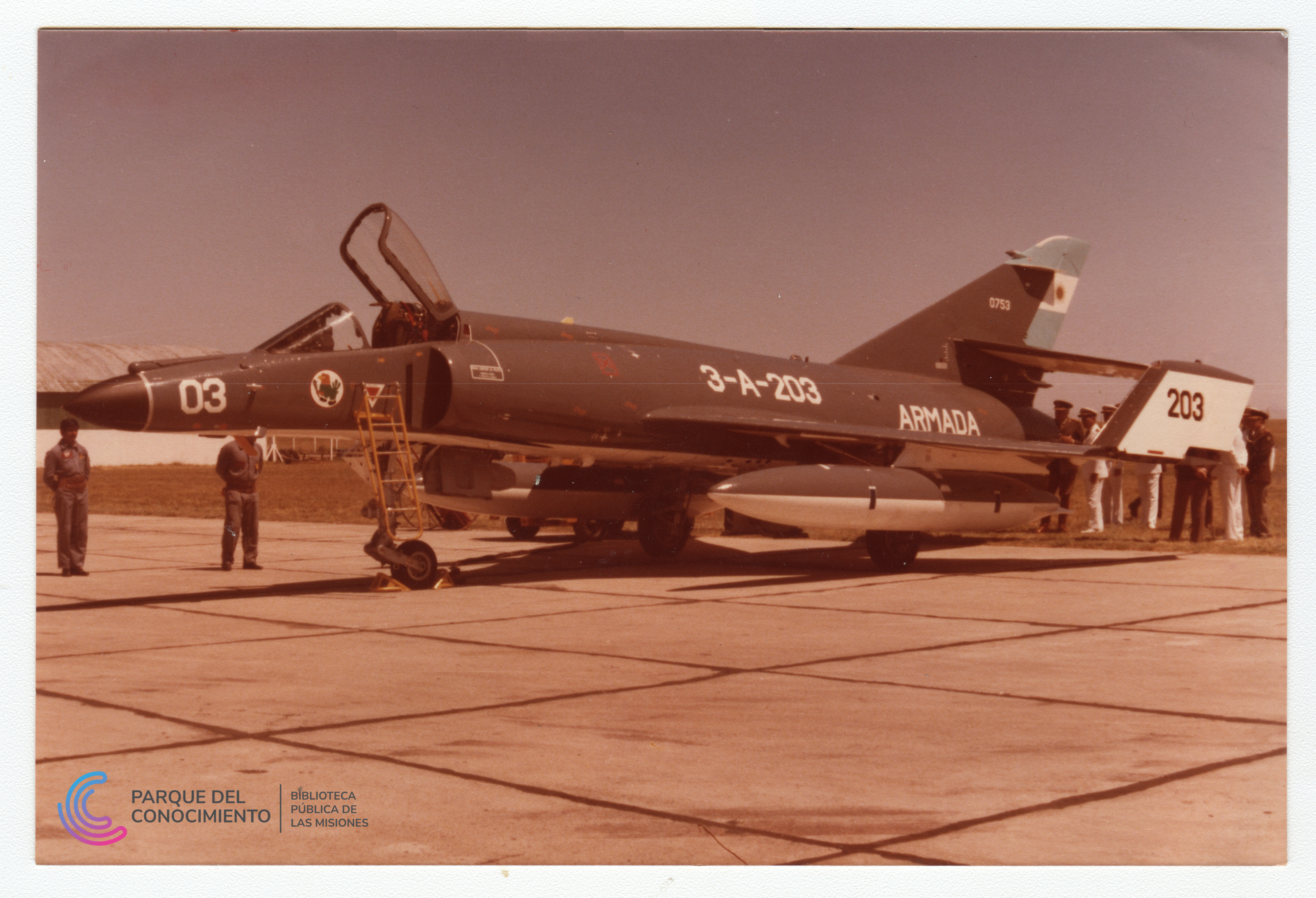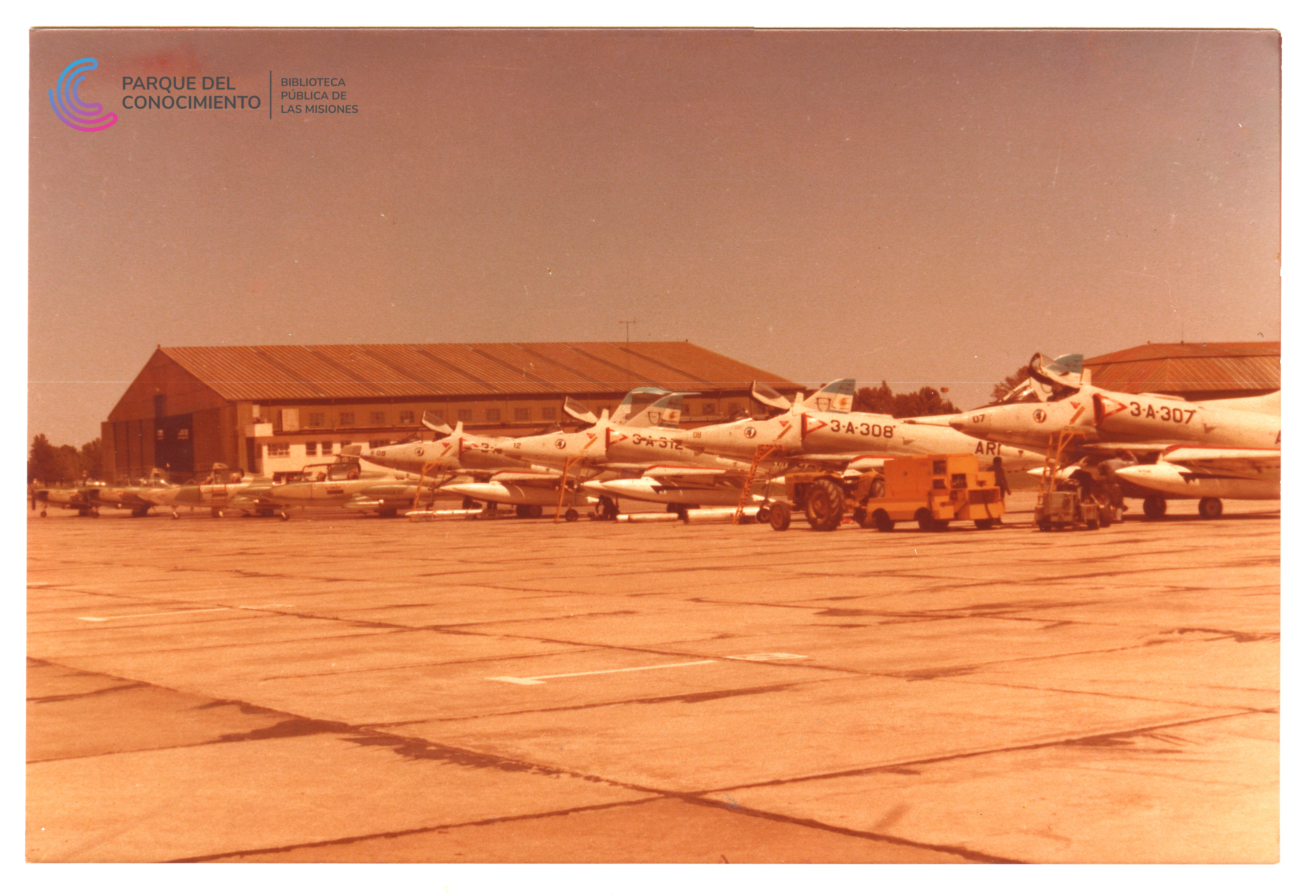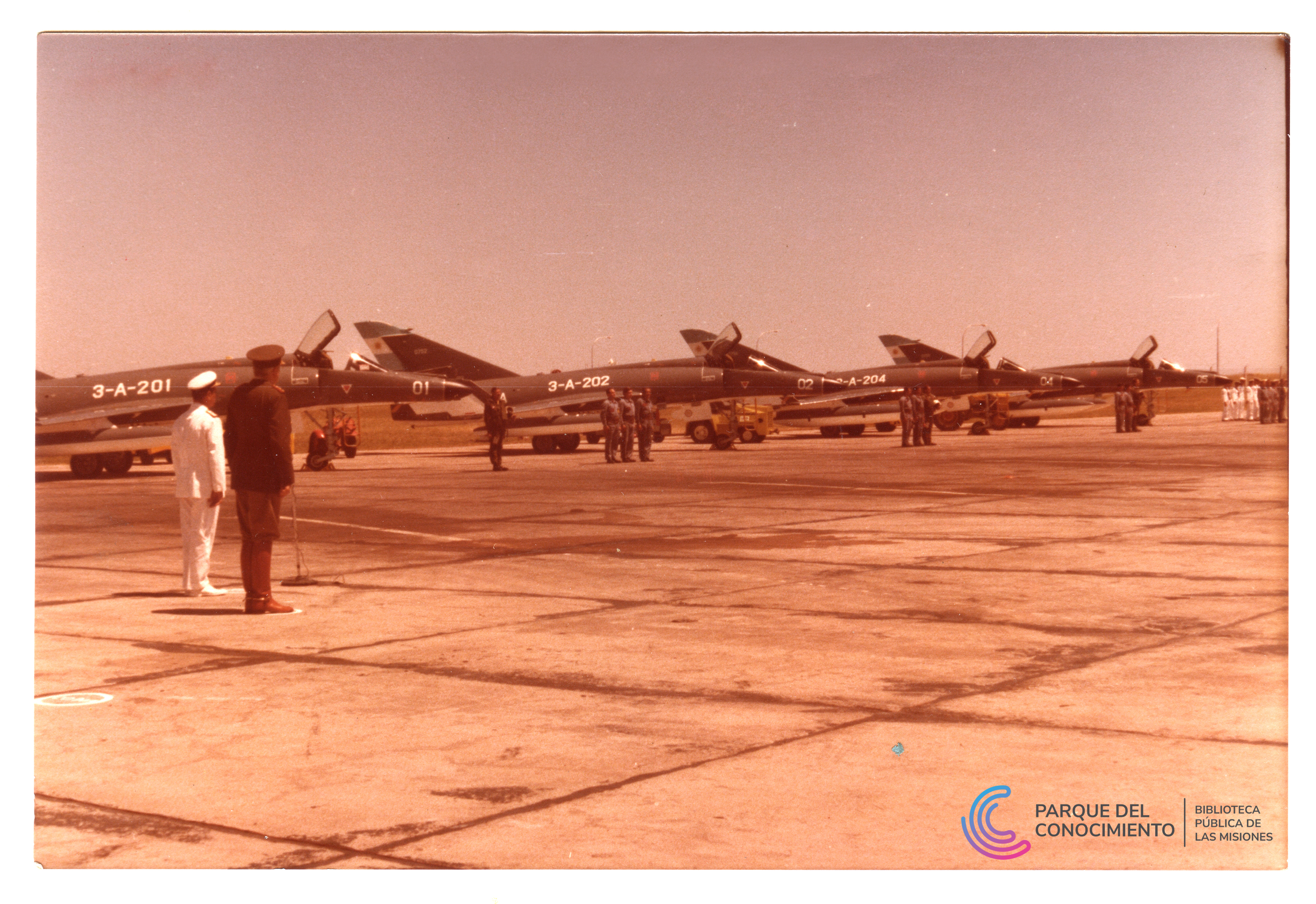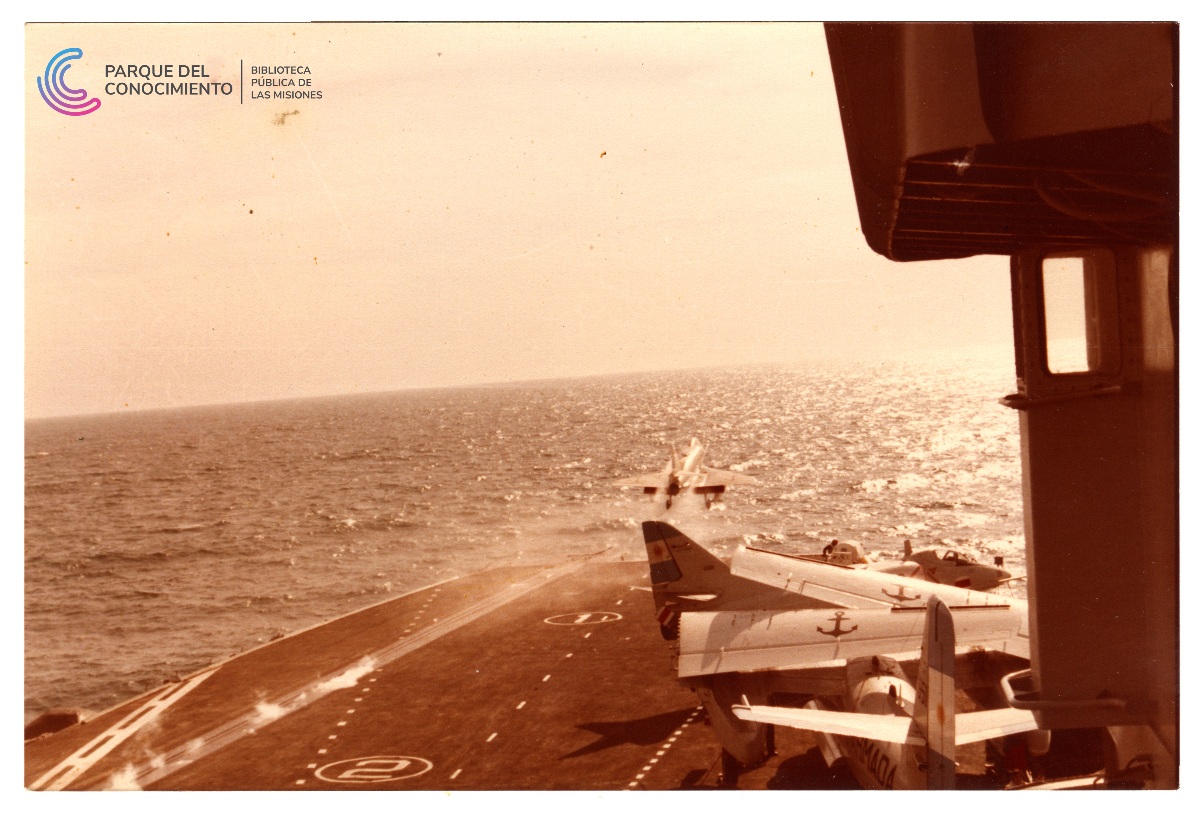 Conjunto de cinco fotografías vinculadas a actividades de la aviación naval argentina en el contexto de la Guerra de las Malvinas. Las imágenes muestran escenas tomadas en cubierta de un buque de la Armada, vistas del mar durante la navegación y diferentes registros de aeronaves militares en plataformas aéreas, incluyendo tareas operativas y presencia de personal naval. El material forma parte de documentos preservados mediante digitalización. Fotografía Nº1: Vista del atardecer sobre el mar tomada desde la cubierta de una embarcación de la Armada Argentina. En el sector izquierdo se observa una bandera argentina izada mientras el sol desciende sobre el horizonte marítimo. Fotografía Nº2: Vista de la cubierta de un portaaviones con varias aeronaves navales estacionadas y una despegando. Se observa parte de la superestructura del buque y, al fondo, el mar abierto. Fotografía Nº3: Plataforma aeroportuaria con varias aeronaves militares de la Armada Argentina alineadas frente a hangares, pudiendo identificar las matrículas visibles con los números 3-A-307, 3-A-308, 3-A-312 . En el área se distinguen vehículos de apoyo y personal técnico. Fotografía Nº4: Primer plano de una aeronave militar identificada con la matrícula 3-A-203 estacionada en plataforma. Se observan técnicos y personal militar en las proximidades del avión. Fotografía Nº5: Vista de cuatro aeronaves militares alineadas en una plataforma aérea mientras personal naval se encuentra formado frente a ellas. Matrículas 3-A-201 a 204.