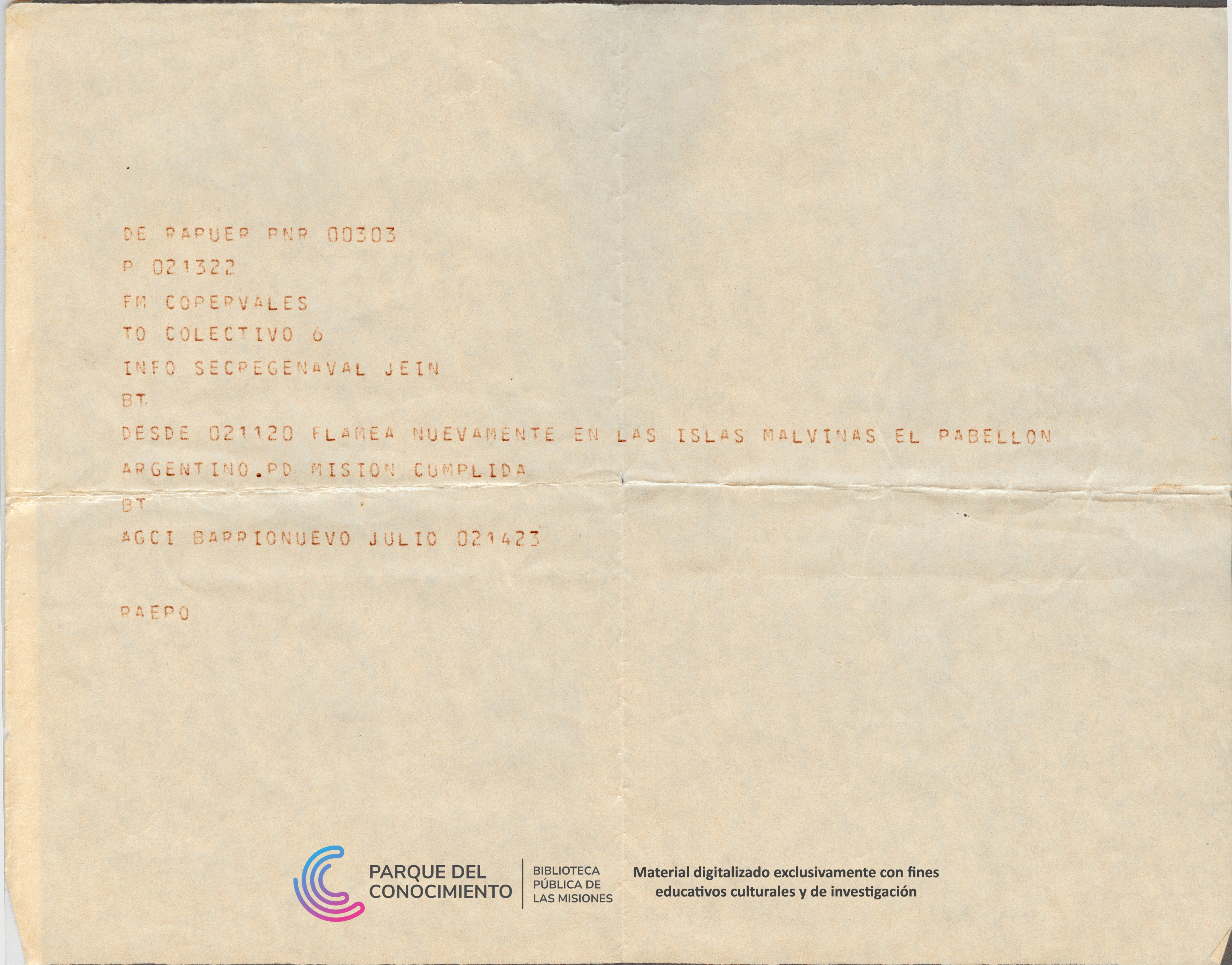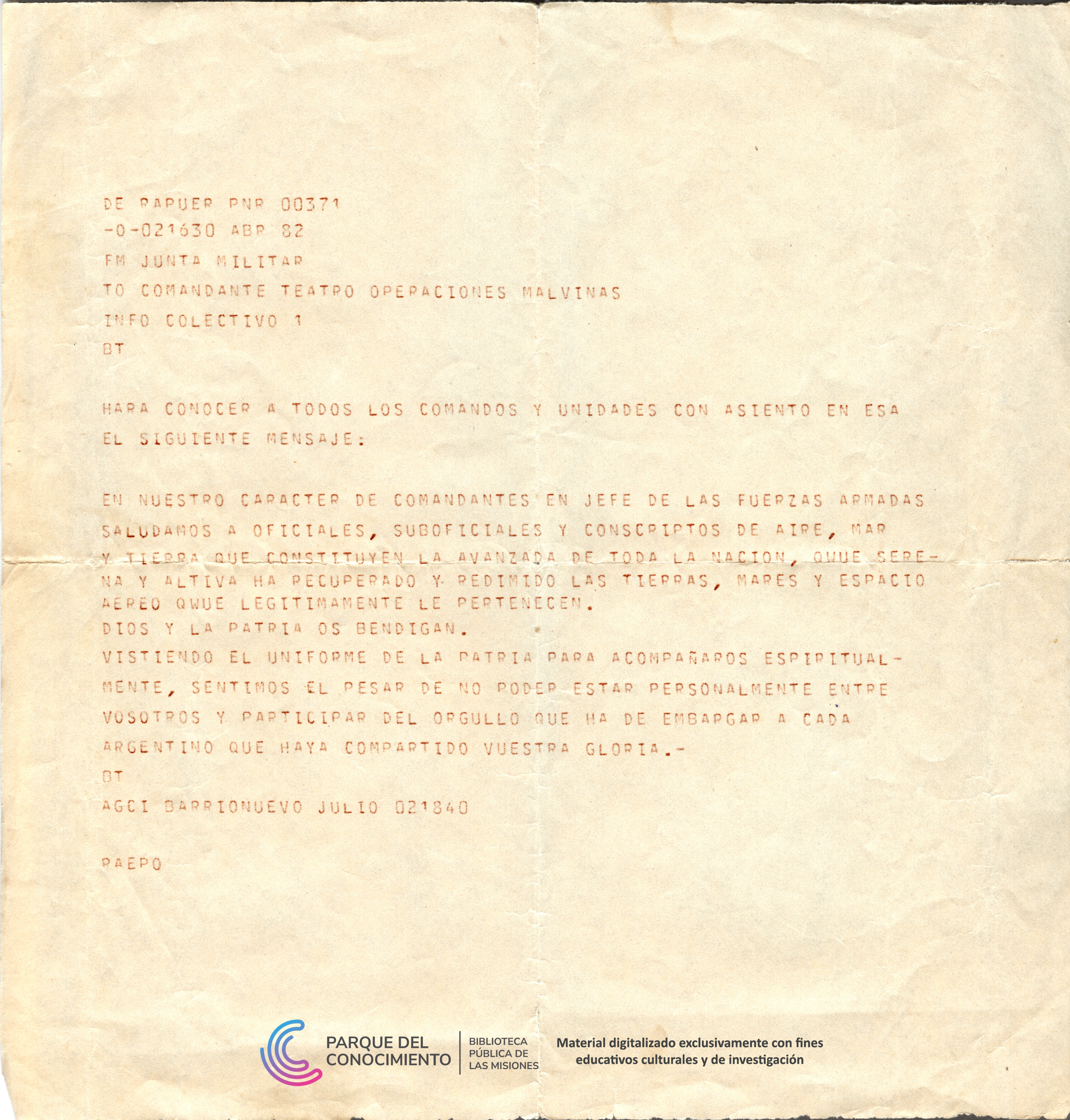 Los documentos reflejan distintos tipos de comunicación dentro del ámbito militar: por un lado, un mensaje informativo breve que da cuenta del cumplimiento de la misión, y por otro, una comunicación institucional de la Junta Militar dirigida a las fuerzas en operaciones. Ambos presentan el formato característico de las transmisiones telegráficas, con códigos, abreviaturas y estructura técnica propia de la época, incluyendo referencias horarias en el encabezado. Telegrama Nº1: Comunicación militar emitida el 2 de abril de 1982 que informa el izamiento del pabellón argentino en las Islas Malvinas, indicando el cumplimiento de la misión. El mensaje presenta formato técnico de transmisión telegráfica con códigos operativos, encabezados institucionales y referencias propias de las comunicaciones militares de la época. Telegrama Nº2: Comunicación militar emitida por la Junta Militar el 2 de abril de 1982, dirigida al Comandante del Teatro de Operaciones Malvinas. El mensaje dispone la difusión de un saludo institucional a las fuerzas desplegadas, destacando la recuperación de los territorios y transmitiendo expresiones de carácter patriótico y espiritual hacia el personal militar. El documento incluye referencias horarias y de transmisión propias del sistema telegráfico militar.